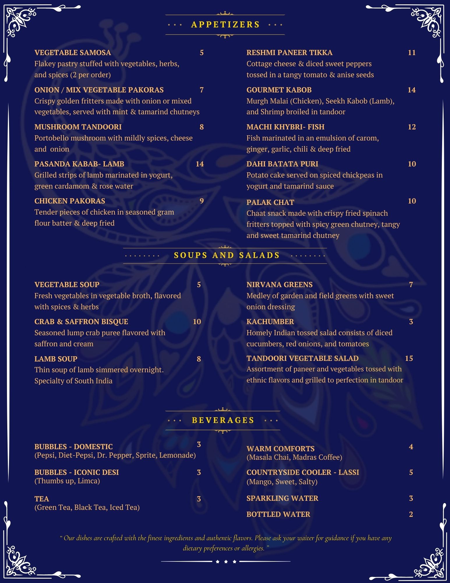 Nirvana Indian-Pakistani restaurant offers a wide variety of food options for the à la carte menu. There is something for everyone, regardless of dietary preferences.
